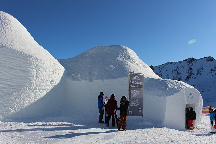 Ubicado a 2600m sobre el nivel del mar, Ice Camp 2020 comprende tres iglúes de diseño único, cada uno de 12m de diámetro y 6m de altura. La pieza central es el único Sinfonio de hielo creado por el artista austríaco Max Seibald. Hecho completamente de hielo, este impresionante instrumento es esencialmente una especie de 'cuenco' trompetas gigantes y estilizadas. Los visitantes pueden usar los pads táctiles para cambiar los sonidos que, como dice el artista, «generan una atmósfera de armonía sublime en combinación con la suave "música de las esferas"».