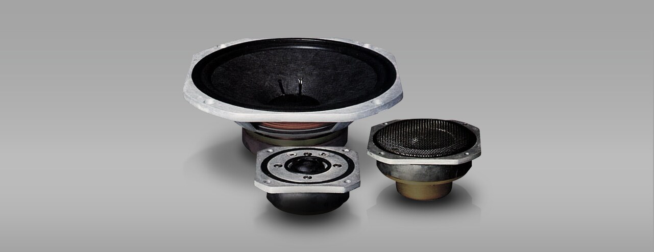 Yamaha’s first two soft-dome drivers designed from scratch — the JA-0701 7.5 cm (3") midrange (pictured front right) and the JA-0509 3 cm (1-1/8") tweeter (front left) — found their way into the NS-690. Their naturally extended frequency response and low distortion as well as broad directionality gave the NS-690 the unique characteristics of a natural-sounding speaker capable of delivering excellent resolution of detail and realism. The diaphragm materials originally developed for the NS-690 continued to be refined and used for almost all of Yamaha’s later soft-dome drivers and for edges on the NS-1000M's JA-3058A woofer and many other woofers as well as on the DC diaphragm tweeters (hard dome) found in our speakers released in the 2000s. Meanwhile, the NS-1 Classic introduced in 1988 had, for the first time, a soft dome made of undyed cotton treated with a minimum amount of resin needed to maintain the diaphragm shape, eliminating the need for dual-layer coating of form-stabilising resin and viscoelastic resin.