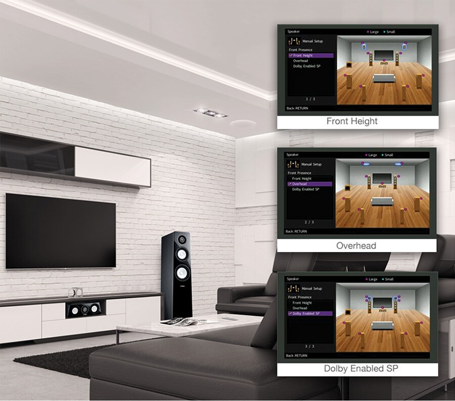 Yamaha ofrece múltiples patrones de colocación para altavoces de presencia que soportan Dolby Atmos creando un campo sonoro ideal para su instalación.