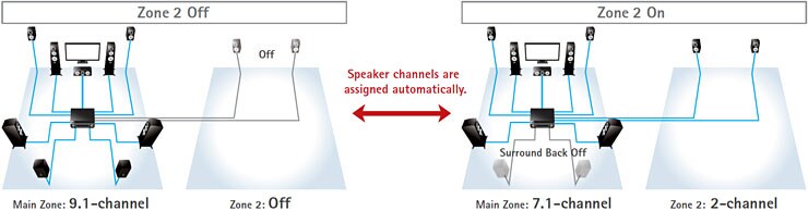 HDMI zone switching offers the ability to individually select and send HD video programmes to two separate zones. Watch a Blu-ray Disc™ movie in the Main Zone while an HD cable TV broadcast plays in another room (Zone 2).