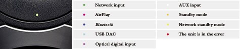 The front of the speaker provides an LED display indicator color coded by operating status: orange for ECO Standby mode, green for network function, pink for AirPlay and sky blue for USB DAC, allowing easy, making it very easy to confirm the music source currently selected.