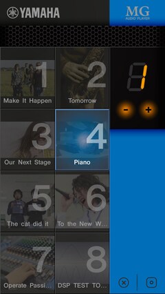 La función de reproductor de audio cuenta con 9 bancos independientes con 8 fichas que se les pueden asignar hasta 8 canciones o efectos de sonido de tu biblioteca de música del iPhone / iPad. Esto proporciona a los usuarios la reproducción de alta calidad de hasta 72 canciones / efectos de sonido con sólo tocar la imagen de mosaico asignado de cada archivo de audio correspondiente. Esta reproducción instantánea ofrecida por MG Rec & Play presta una valiosa flexibilidad a las aplicaciones de directo que requieren la música de fondo, disparo de pistas de acompañamiento, acompañamiento musical, y fiestas o funciones de entretenimiento que requieren el uso de efectos de sonido.