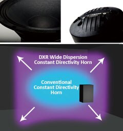 Bocina de directividad constante y dispersión amplia: El transductor de alta frecuencia más grande está montado en una bocina de directividad constante de 90 ° x 60 ° completamente nueva, diseñada con el objetivo de minimizar el deterioro del patrón de radiación en direcciones oblicuas, ya que las bocinas más convencionales son propensas a hacerlo. Esto puede ayudar a lograr un área de cobertura más ideal sin irregularidades. Con la nueva bocina de directividad constante y dispersión amplia, el sonido se expande en un patrón más rectangular que brinda una cobertura vertical de 90 ° horizontal x 60 °, con sonido de amplia frecuencia proyectado hacia los bordes del área de cobertura.