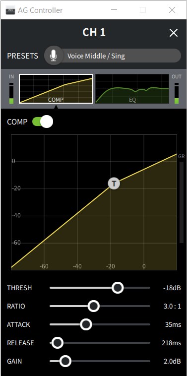 AG Controller es una aplicación de software que te permite controlar las funciones DSP de los AG03MK2, AG06MK2, AG03, AG06 y AG01 desde tu dispositivo Windows/Mac/iOS a través de una conexión USB