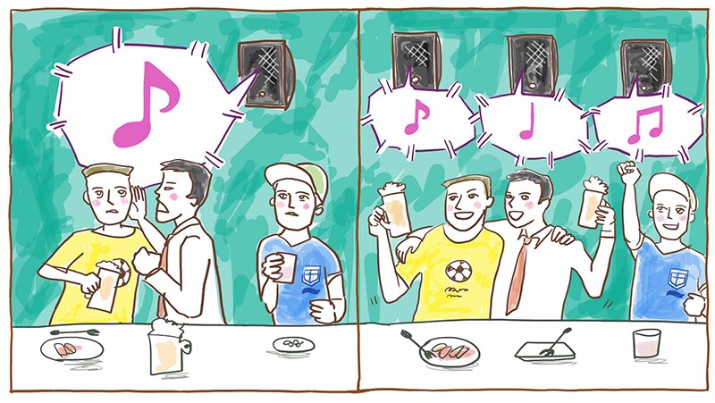 En las tiendas bulliciosas, hay una tendencia a aumentar el volumen de la música para darle energía a la atmósfera. Sin embargo, si hay muy pocos altavoces para un cierto espacio, el aumento del volumen emitido por altavoz puede sonar molestamente ruidoso, en lugar de energizante, haciendo que el espacio sea menos agradable. En esos casos, recomendamos aumentar el número de altavoces, de modo que el volumen de cada altavoz se pueda disminuir para lograr un sonido más equilibrado.