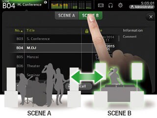 Las memorias de escenas disponen de los bancos A y B, cada uno de ellos con capacidad para almacenar hasta 100 escenas. Esto hace un total de 200 escenas que pueden configurarse y recuperarse instantáneamente siempre que se necesiten. Hay una serie de escenas preprogramadas para que los usuarios dispongan de una ventaja inicial: escenas en las que se emplean los controles de compresor y ecualización de mando único para que la operatividad resulte lo más fácil posible, y escenas en las que las funciones de mando único están desactivadas pensando en los ingenieros experimentados que seguramente preferirán seguir un procedimiento establecido. Los bancos son muy útiles para organizar los diferentes tipos de escenas: por ejemplo, uno para escenas categorizadas según el tipo de música y otro según el tipo de evento.