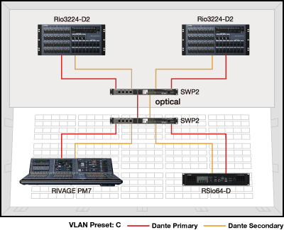 En este ejemplo, VLAN Preset C se configuró en los switches de la serie SWP2, con la línea primaria Dante asignada a VLAN1 y la línea secundaria asignada a VLAN2. Solo se necesitan dos switches para conexiones de cable redundantes.