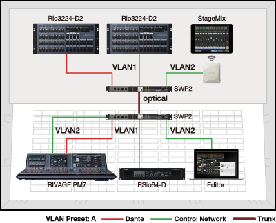 En este caso, se utiliza el Preset A de VLAN, donde VLAN1 maneja la red Dante mientras que VLAN2 aloja señales de control, como el Editor o StageMix de las señales de audio de Dante, lo que hace que la red sea más estable.