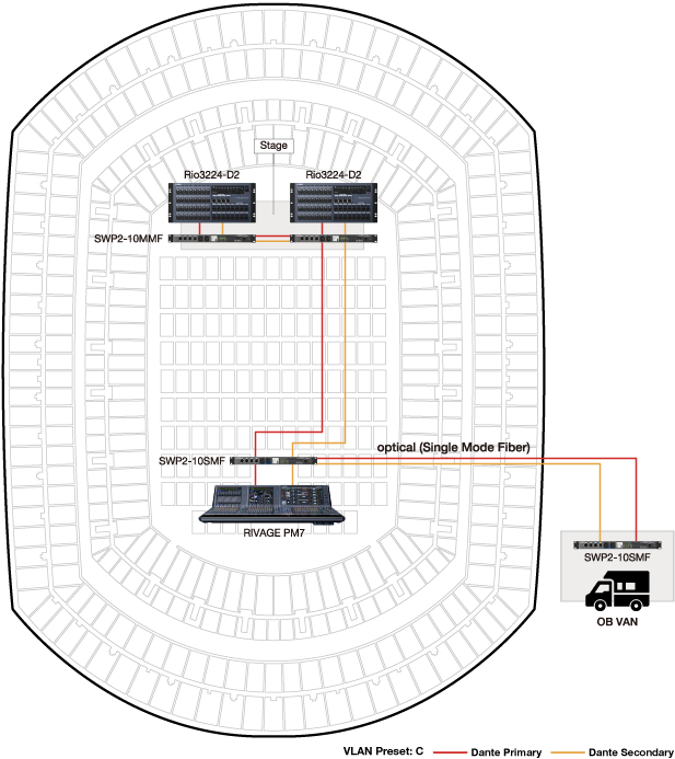 En este ejemplo, VLAN Preset C se configuró en los switches SWP2-MMF y SWP2-SMF, con la línea primaria Dante asignada a VLAN1 y la línea secundaria asignada a VLAN2. El modo único de conexión de fibra óptica entre los switches permite la transmisión confiable de datos en distancias de hasta 10 kilómetros.