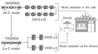 Esta figura muestra un sistema ideal para un restaurante con áreas de bar y terraza. El MA2120 está configurado para enviar señal a líneas de 100 voltios, accionando un total de ocho altavoces de montaje en superficie VXS3FT a través de sus tomas de transformador de 3,8 W, así como cuatro altavoces de techo VXC3F. El MA2120 puede proporcionar diferentes zonas con diferentes volúmenes en cada zona respectiva. El PA2030a, en modo de conexión de baja impedancia a 4 Ω, acciona un total de cuatro altavoces de montaje en superficie VXS5 en paralelo, proporcionando la misma música de fondo a un nivel superior.
