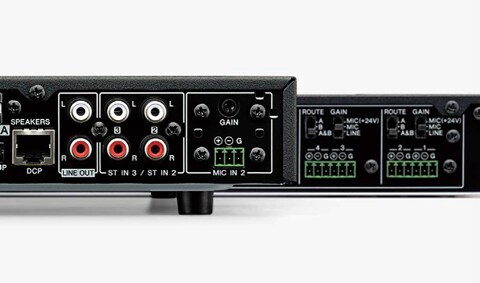 Amplificador clase D conmutable(Lo-Z: 120W x2 @4Ω, 100W x 2 canales @ 3Ω/8Ω, Hi-Z: 120W x 2 canales o 200W x 1 canal, 70V/100V) equipado con 6 entradas de micrófono/línea, 2 entradas estéreo y funciones DSP potentes para reproducir música de alta calidad y para micrófono.