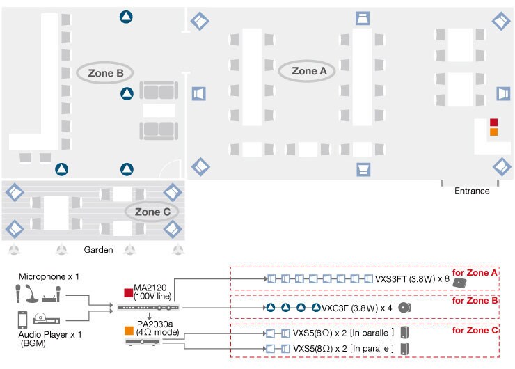 Este sistema es adecuado para su uso en salas de conferencias o salones de actos. Se utiliza un MA2030a en modo de 8 Ω y un PA2030a en modo de 4 Ω accionando un par de altavoces de montaje en superficie VXS5 (8 Ω cada uno) y cuatro altavoces de techo VXC4 (8 Ω cada uno) respectivamente. Se pueden conectar múltiples micrófonos al MA2030a y el nivel global de salida en la sala se puede controlar fácilmente mediante el mando de volumen del panel frontal.