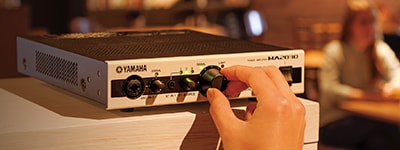 Amplificador clase D conmutable Lo-Z/Hi-Z (Lo-Z: 30W x 2 canales, Hi-Z: 60W x 1 canal) equipados con 3 tipos de entradas de micrófono seleccionables, 2 entradas de micrófono y funciones DSP potentes para reproducción de música de alta calidad y para micrófono.