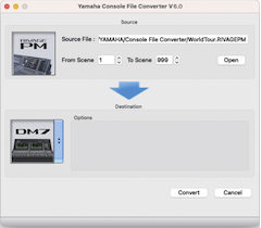 El convertidor de archivos de consolas Yamaha es una aplicación que permite compartir datos entre varias consolas de mezcla digital de Yamaha. Puedes compartir datos entre las consolas de la serie RIVAGE PM, la serie DM7, la serie CL/QL, PM5D, M7CL y LS9 para no tener que volver a programar de cero los datos de un espectáculo para el siguiente, incluso cuando se usan diferentes consolas.