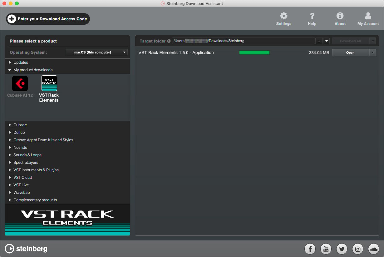 Ingresa tu código de acceso de descarga desde el botón en la parte superior izquierda en Steinberg Download Assistant.