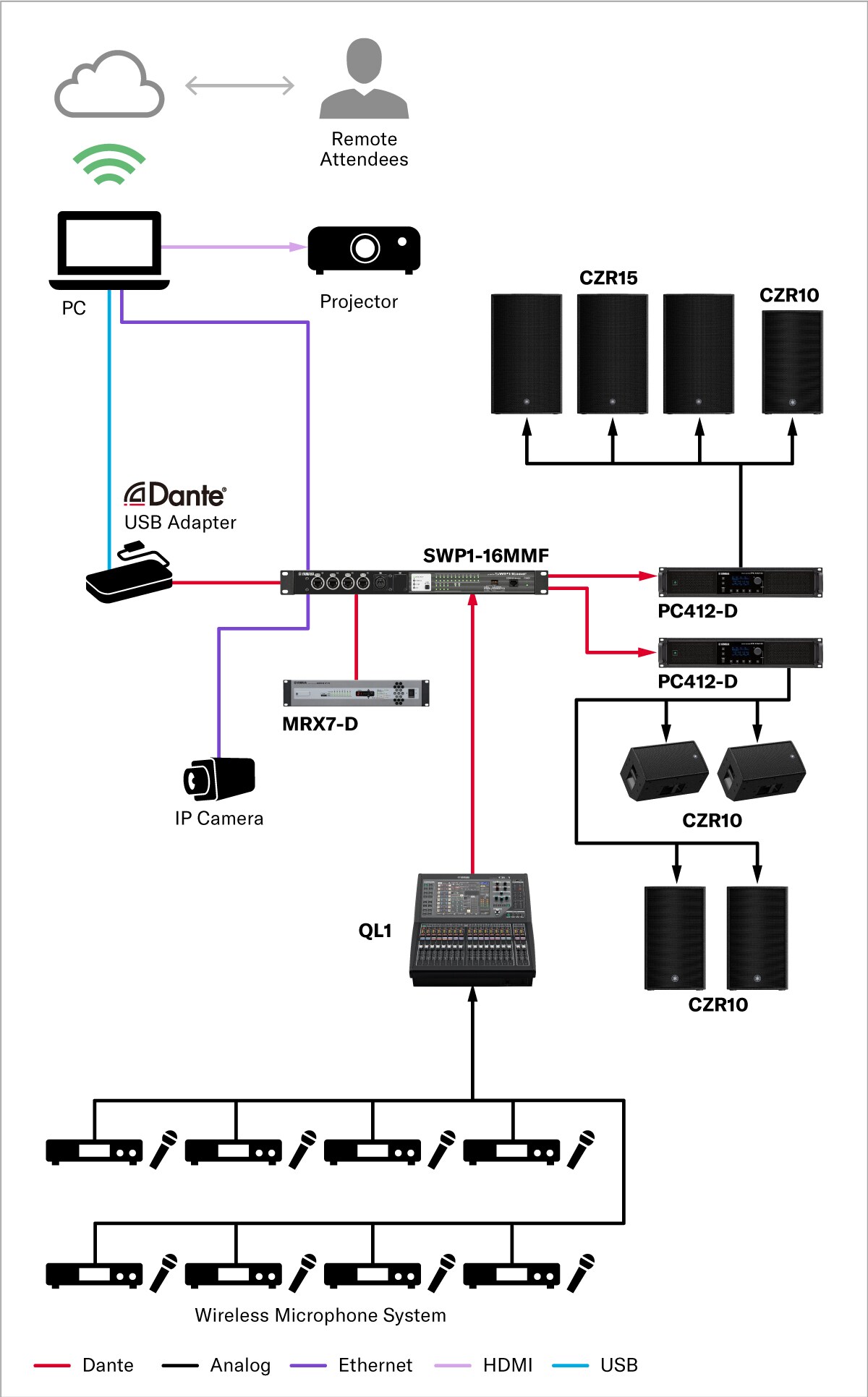 Este sistema está diseñado para entornos de PA y distribución remota a gran escala, como auditorios. Centradas en un mezclador digital y una selección de altavoces de fuente puntual o de matriz lineal que también podrían usarse en combinación con los altavoces NEXO, las soluciones PA de Yamaha también pueden incorporar nuestros productos habilitados para Dante para minimizar el cableado y el tiempo de configuración del sistema. Espere un audio nítido, uniforme y potente tanto para el escenario como para la participación remota cuando elija Yamaha como refuerzo de sonido de alto rendimiento.