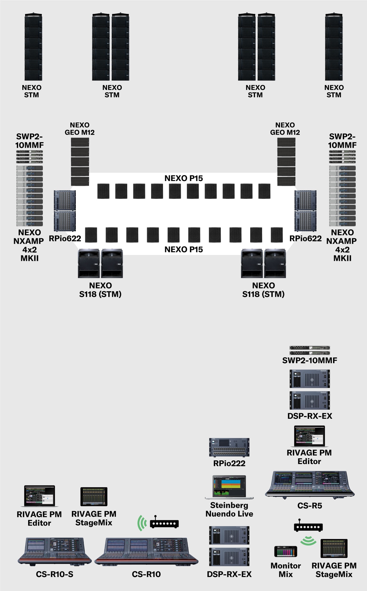 Debido a su tamaño compacto, funcionamiento flexible y calidad de sonido superior, la consola de mezclas insignia RIVAGE PM de Yamaha se ha convertido en un refuerzo estándar de la industria del sonido en vivo, ganando el reconocimiento internacional de algunos de los artistas más populares que están de gira en la actualidad. Los sistemas de altavoces line array STM de NEXO actúan como el complemento perfecto, apoyando de manera flexible al RIVAGE PM como una solución potente y escalable que se puede adaptar para satisfacer las demandas de varios lugares en vivo y brindar una experiencia sonora memorable para todos los asistentes.