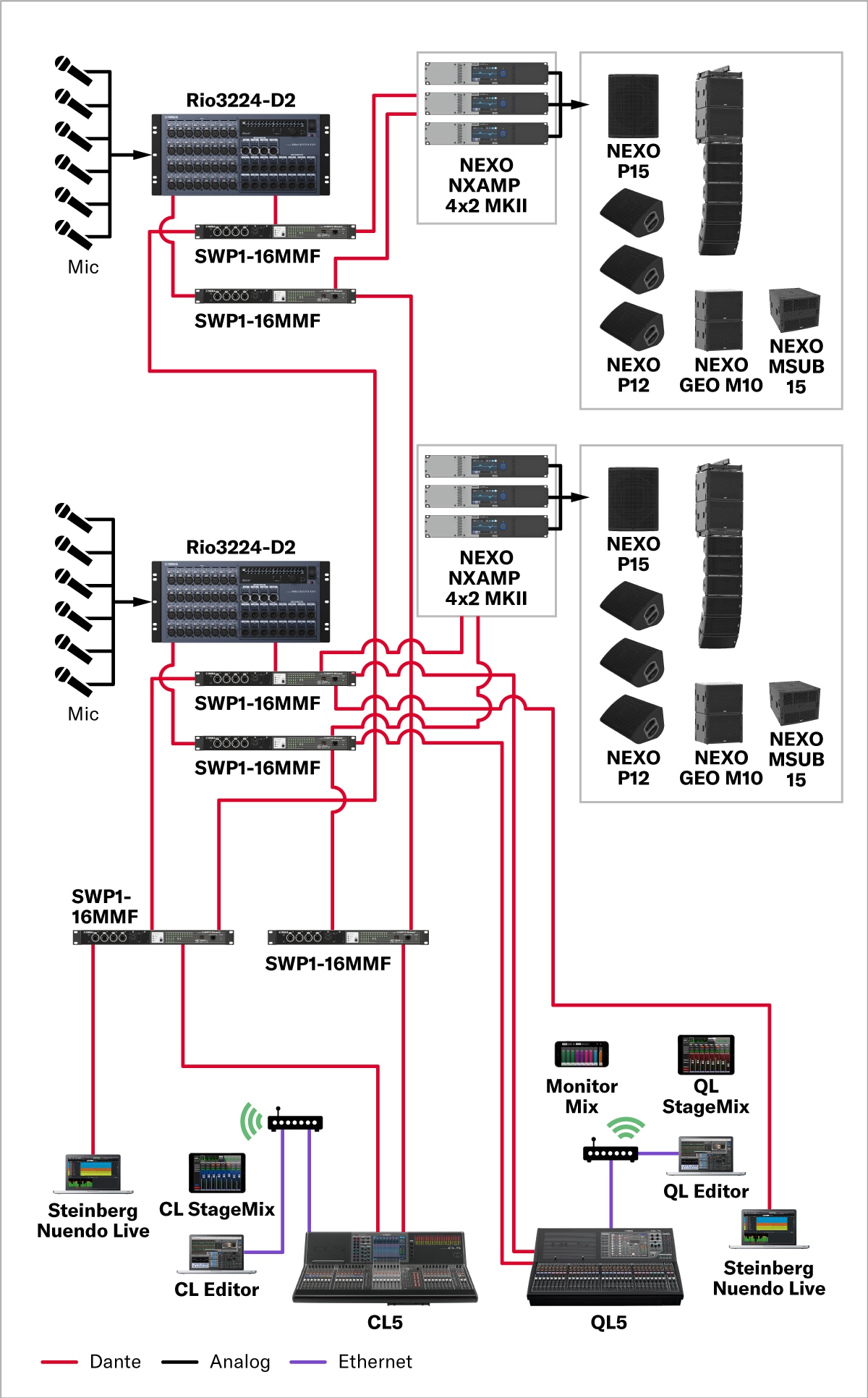 Con la red de audio Dante estándar de la industria, este sistema permite enrutar cientos de canales a través de un solo cable Ethernet, lo que facilita significativamente la configuración del sistema y, al mismo tiempo, admite conexiones redundantes para garantizar la confiabilidad. Los mezcladores digitales de la serie CL/QL son pilares de la industria, reconocidos por su calidad de sonido, potente funcionalidad y flexibilidad, lo que los hace adecuados incluso para eventos más grandes a pesar de su diminuto tamaño. Combinado con los altavoces NEXO GEO M12 compactos y de alto rendimiento, este sistema puede ofrecer de manera confiable un sonido de concierto de alto rendimiento, requiriendo solo un pequeño número de personas para operarlo, configurarlo y transportarlo al siguiente lugar.