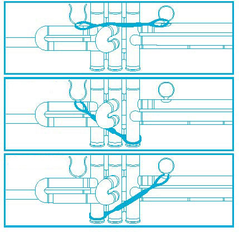 Thinner valvecasing and pistons, as well as the modified angle of the branch tube (Knuckle, marked blue in the photo), result in improved response and provide the performer with an ideal appropriate resistance.Modifications to the shapes of the piston button, top cap, and bottom cap, as well as production refinements, have made it possible to deliver a deeper tone while improving projection.