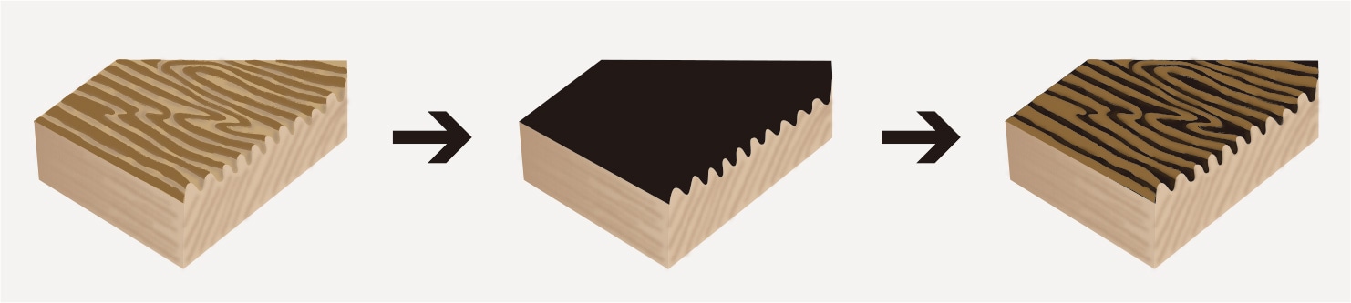 La técnica de acabado japonesa tradicional conocida como «UZUKURI» se ha modificado para su uso en tambores. En este procedimiento, las partes blandas del grano de la madera se lijan y luego toda la cubierta se cubre con una capa delgada de pintura negra. Toda la superficie del tambor se vuelve a lijar nuevamente antes de aplicar el recubrimiento final, en un proceso que enfatiza la belleza natural del grano de roble.