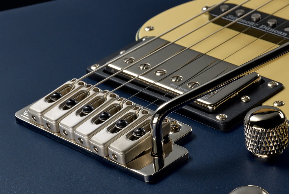 Clavijas de bloqueo Gotoh, combinadas con el puente de trémolo de 2 puntos Gotoh, garantizan funcionamiento impecable y afinación estable extraordinaria.