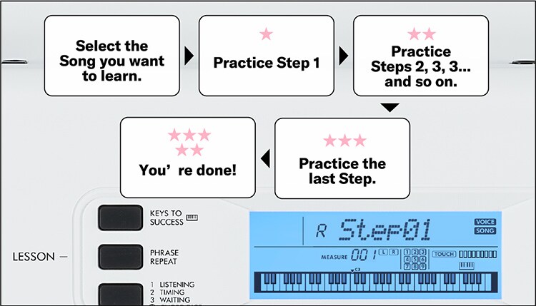 Toca solo las teclas iluminadas y haz música hermosa, de manera natural y sin esfuerzo. Sientes el gusto fácilmente, y es divertido practicar y tocar. Y si quieres mejorar más, practica a tu ritmo con las tres funciones de lecciones. Practica las partes de mano derecha y la mano izquierda y divide la canción en secciones para repetir la práctica. La teclas iluminadas te guían y te ayudan a disfrutar de tocar, incluso si no lees música.
