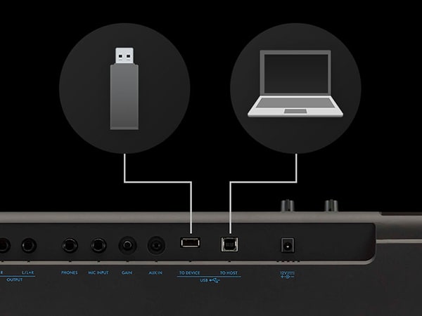 Una variedad de opciones de conectividad brindan todo el apoyo que necesitas para practicar, tocar y actuar. Conecta un micrófono para intentar cantar mientras tocas, usa la aplicación Rec'n'Share para compartir tu música con el mundo y conéctate a los sistemas de megafonía para actuar en el escenario.