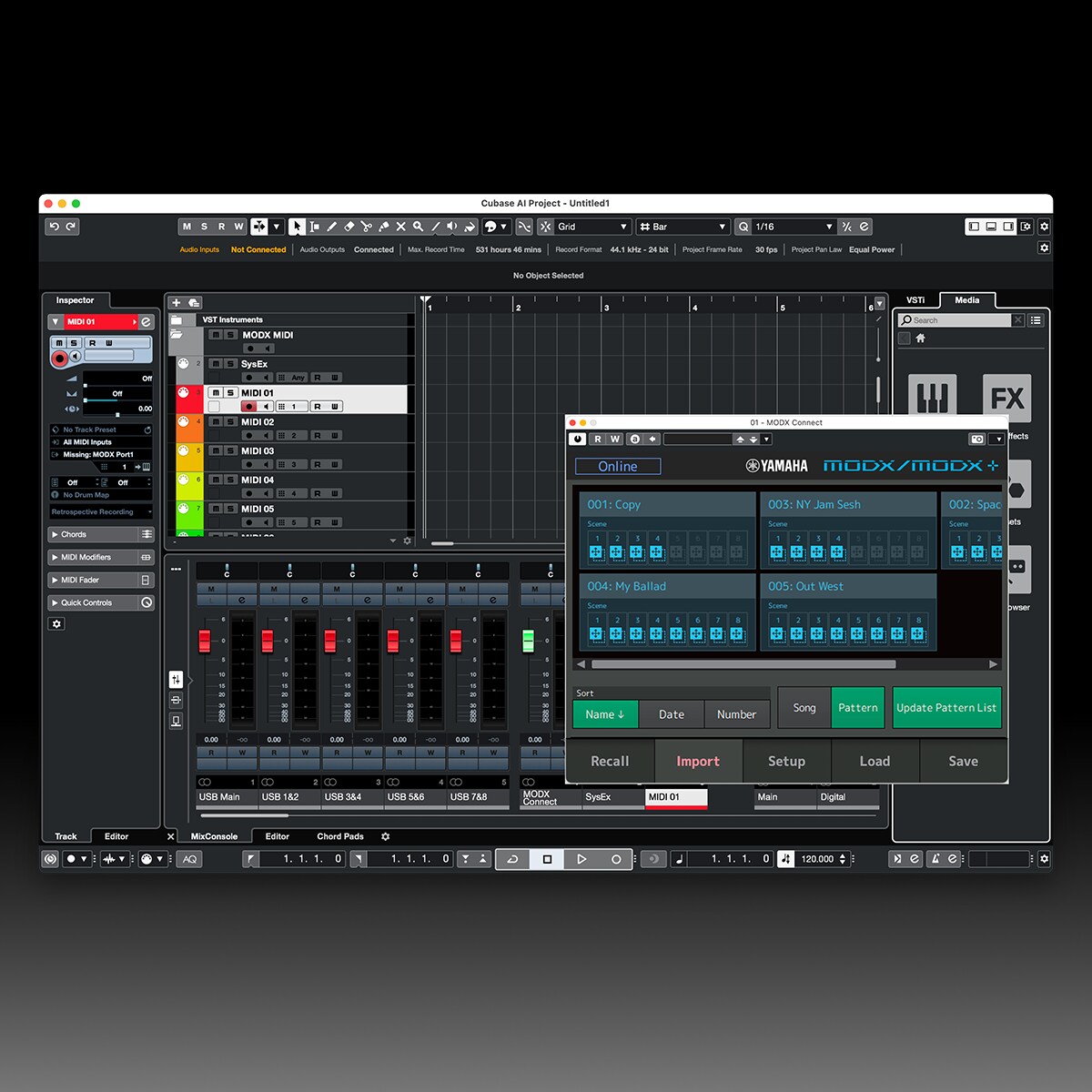 MODX+ Connect, basado en la tecnología VST3 de Steinberg, funciona como complemento VST3 con la serie Cubase. El MODX+ Connect también funciona como otros software de instrumentos VST, que les permite guardar ajustes guardados en el MODX+, o usarlos para otro proyecto.