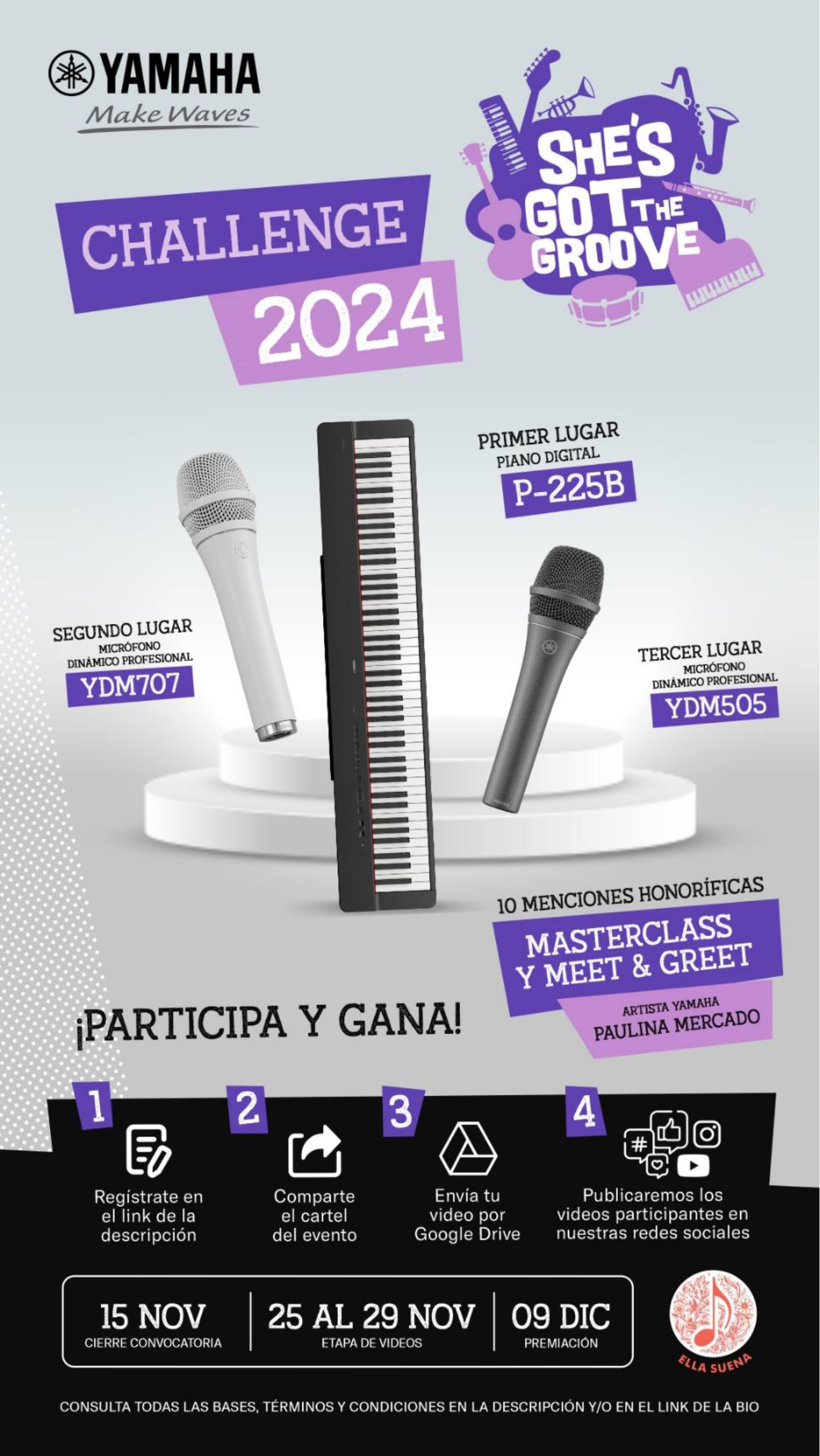 El sorteo forma parte de la iniciativa de Yamaha “She’s got the groove” en colaboración con "Ella suena". Los objetivos de esta dinámica son apoyar, visibilizar e impulsar las carreras de las ganadoras, quienes serán seleccionadas a manera de concurso, por la decisión de un jurado conocedor.